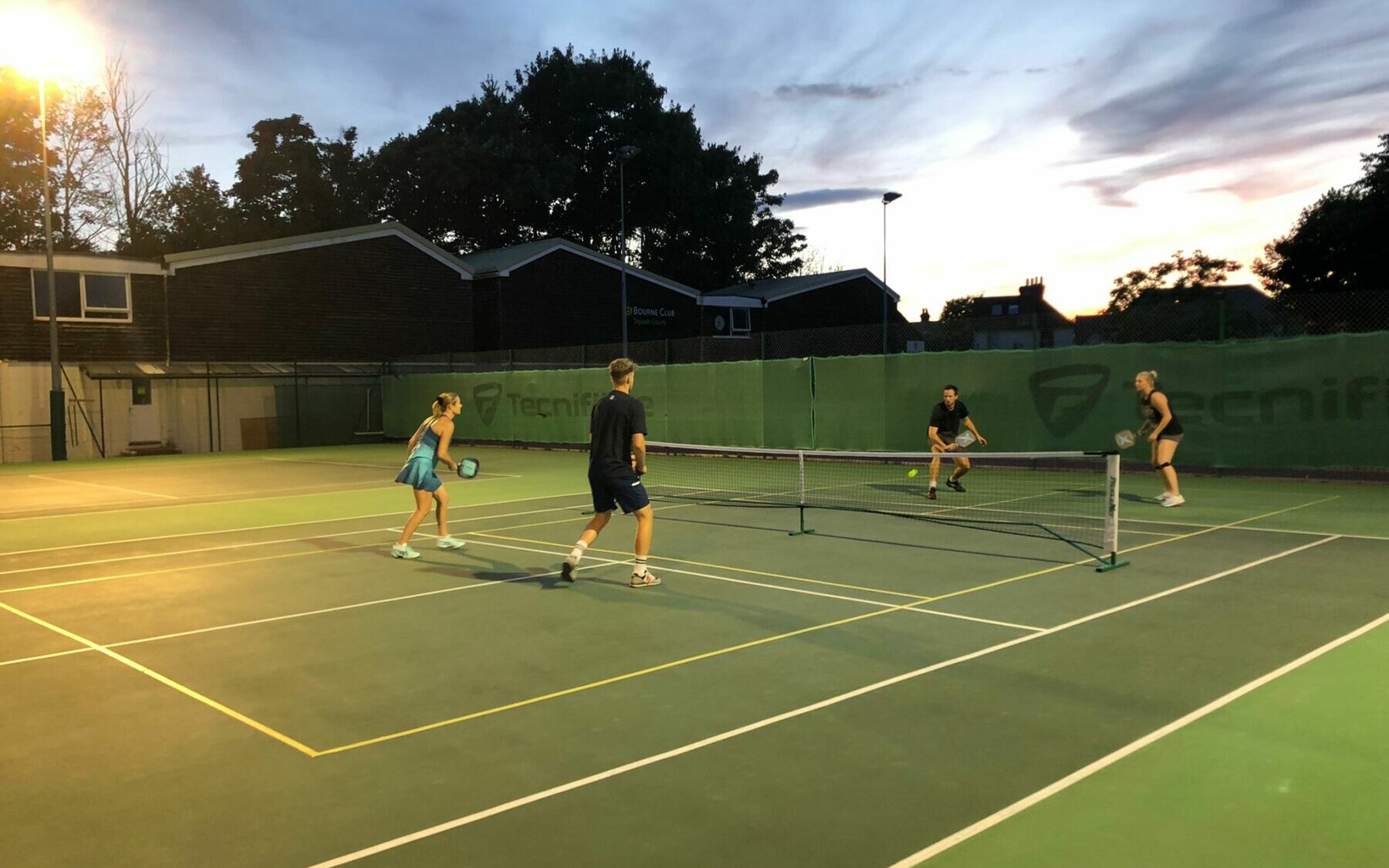 Best described as a cross between tennis, badminton and table tennis, is enjoyed by players from all racket sports at the Bourne Club. Played on badminton sized courts, with a tennis net, usually as doubles, it is fast and fun. Underarm service and a smaller court size make it a great substitute for anyone too injured for tennis.
